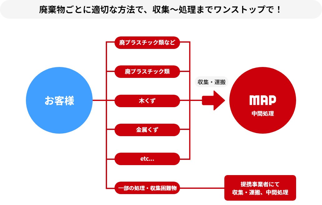 また、MAPの強みは、工場から出る工業系廃棄物や、自動車関連の廃棄物、オフィス廃棄物やオフィス・店舗移転に伴う廃棄物の収取運搬・処理を専門としていること。