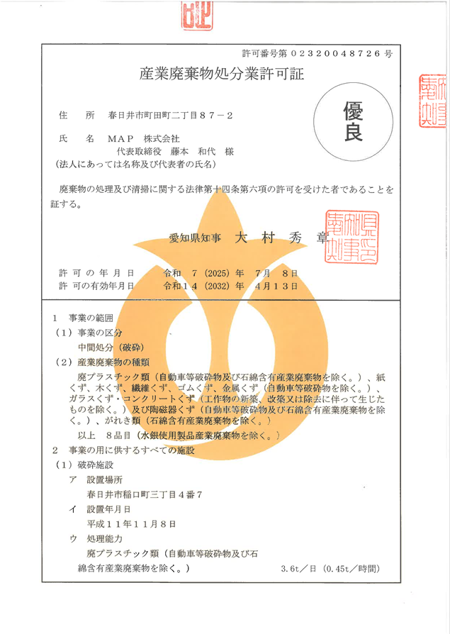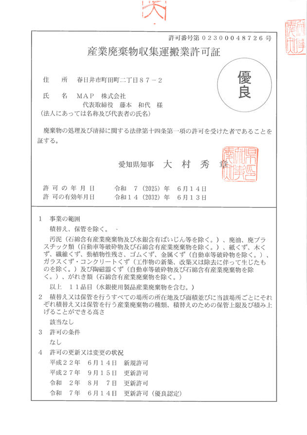 このたびMAPは、「産業廃棄物処理業の優良認定」を取得いたしました。