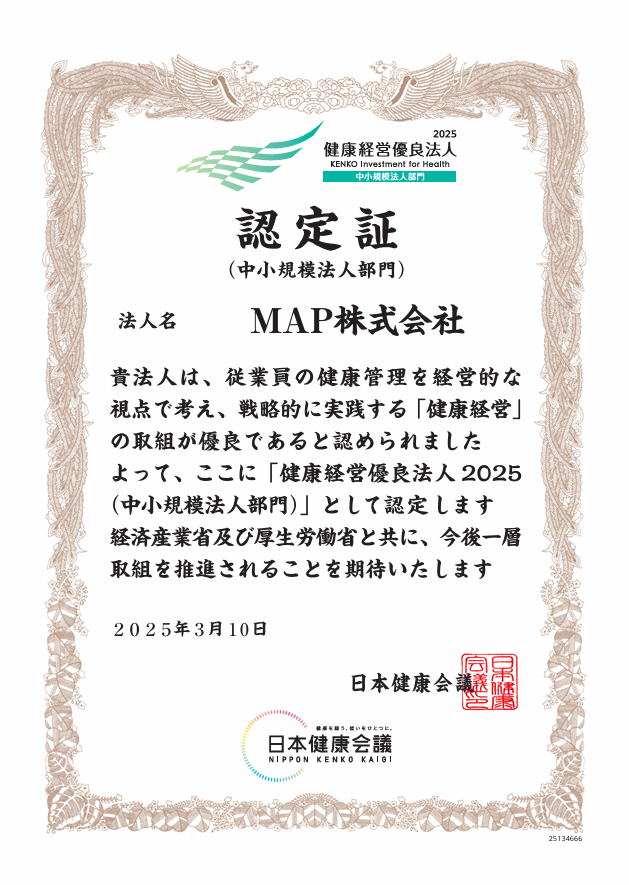 MAPは、経済産業省が推進する「健康経営優良法人」での中小規模法人部門にて認定されました。これは、従業員の健康を経営の重要な資産と捉え、戦略的に取り組む企業として認められた証です。私たちは、働く人の心と体の健康が、ブランドの力になると信じています。日々の業務の中で、無理なく、楽しく、健やかに働ける環境づくりを進めていまいります。 Post Share Hatena LINE RSS feedly Pin it note この記事のタイトルとURLをコピーする 愛知県 伴走型省エネ診断【2025年9月3日】 前の記事 加山興業㈱様工場見学させていただきました。【2025年10月28日】 次の記事